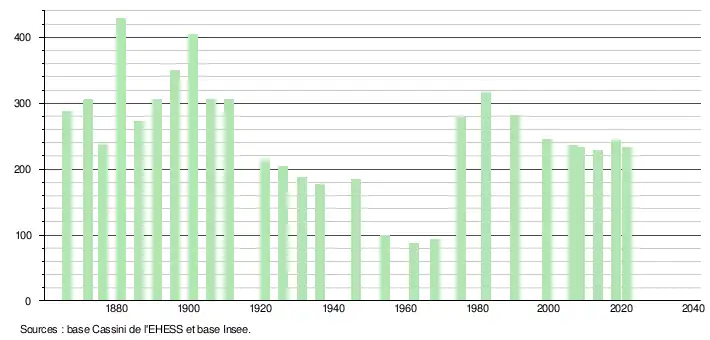 L'évolution du nombre d'habitants est connue à travers les recensements de la population effectués dans la commune depuis 1866. Pour les communes de moins de 10 000 habitants, une enquête de recensement portant sur toute la population est réalisée tous les cinq ans, les populations légales des années intermédiaires étant quant à elles estimées par interpolation ou extrapolation[7]. Pour la commune, le premier recensement exhaustif entrant dans le cadre du nouveau dispositif a été réalisé en 2008[8].