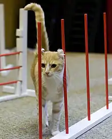 À la manière de l'agility pour les chiens, le parcours comprend une dizaine d'obstacles tels que des barrières à sauter, des plots à contourner, des cerceaux, des escaliers et un tunnel[1],[2]. Les obstacles sont organisés en cercle, dans un enclos fermé pour éviter toute fuite[2]. Le chat doit passer tous les obstacles en moins de 4 minutes et 30 secondes[3].