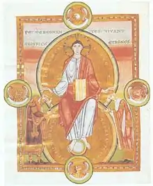 Henri III et Agnès, miniature du Codex Aureus de l'Escurial, vers 1046. | |