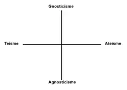 - L'athéisme, qui considère qu'il n'y a pas de dieu, ou en tout cas pas de raison de supposer qu'il y en ait un. Richard Dawkins présente l'agnosticisme comme simplement la version politiquement correcte de l'athéisme, proposant une démonstration qu'elle ne s'en distingue en rien concrètement[3].