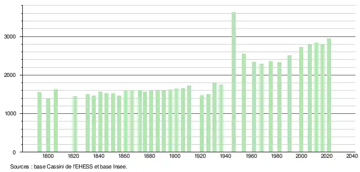 L'évolution du nombre d'habitants est connue à travers les recensements de la population effectués dans la commune depuis 1793. Pour les communes de moins de 10 000 habitants, une enquête de recensement portant sur toute la population est réalisée tous les cinq ans, les populations légales des années intermédiaires étant quant à elles estimées par interpolation ou extrapolation[40]. Pour la commune, le premier recensement exhaustif entrant dans le cadre du nouveau dispositif a été réalisé en 2006[41].