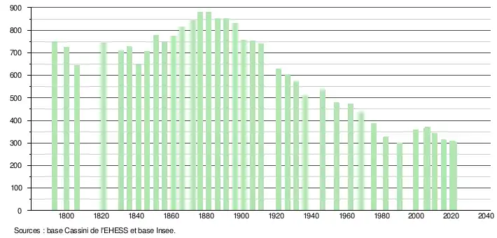 L'évolution du nombre d'habitants est connue à travers les recensements de la population effectués dans la commune depuis 1793. Pour les communes de moins de 10 000 habitants, une enquête de recensement portant sur toute la population est réalisée tous les cinq ans, les populations légales des années intermédiaires étant quant à elles estimées par interpolation ou extrapolation[28]. Pour la commune, le premier recensement exhaustif entrant dans le cadre du nouveau dispositif a été réalisé en 2005[29].