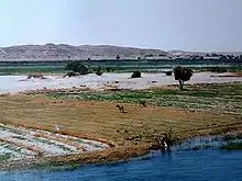 La crue qui représente une montée du fleuve d'environ huit mètres, apporte aux sols voisins du fleuve l'humidité et le limon nécessaires aux cultures. Elle est décrite comme très aléatoire aussi des canaux sont creusés pour apporter l'eau le plus loin possible.