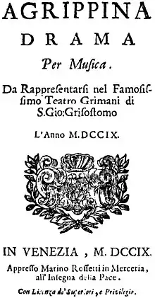 Agrippina (HWV 6) est un opera seria en trois actes composé par Georg Friedrich Haendel, d'après un livret de Vincenzo Grimani. Composé pour la saison 1709-1710 du Carnaval de Venise, l'opéra raconte l'histoire d'Agrippine la Jeune, la mère de Néron, complotant contre l'empereur Claude pour mettre son fils sur le trône. Le livret de Grimani, qui compte parmi l'un des mieux mis en scène par Haendel, est décrit comme une comédie satirique antihéroïque[1], parsemée d'allusions à la vie politique de l'époque. En outre, plusieurs spécialistes pensent que ces allusions font écho à la rivalité qui opposa Vincenzo Grimani et le pape Clément XI.