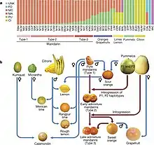 Des travaux de phylogénie par séquençage complet du génome de variétés et formes sauvages remettent en cause en 2018[13] les systèmes taxonomiques élaborés antérieurement, expliquant encore la coexistence de trois classifications botaniques différentes pour les agrumes[14]. Elles montrent deux grandes étapes de diversification évolutive : la première en Asie à la fin du Miocène, entre 6 et 8 millions d’années (peut-être liée à un affaiblissement dramatique des moussons en Asie à cette période), conduit à la séparation en huit embranchements dont quatre espèces ancestrales (Citrus reticulata, Citrus maxima, Citrus medica et Citrus micrantha) à l’origine de la variété des agrumes cultivés actuels, générés par hybridations interspécifiques naturelles (orangers, pomelos, citronniers et limettiers) ; la seconde en Australie au début du Pliocène, il y a environ 4 millions d’années, est à l’origine de trois espèces de lime australienne[15].
