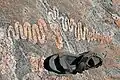 Proche d'Aguanish, on peut apercevoir des plis symétriques dans une veine felsique. Les axes de pliage sont perpendiculaires à la surface d'affleurement. Ils ont probablement été formés au cours de l'orogenèse mésoprotérozoïque grenvillienne.