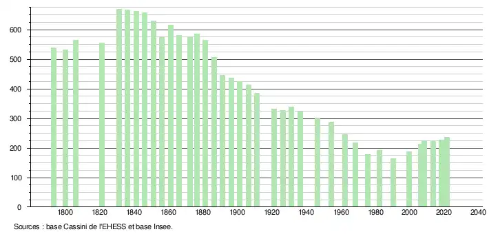 | L'évolution du nombre d'habitants est connue à travers les recensements de la population effectués dans la commune depuis 1793. Pour les communes de moins de 10 000 habitants, une enquête de recensement portant sur toute la population est réalisée tous les cinq ans, les populations légales des années intermédiaires étant quant à elles estimées par interpolation ou extrapolation[29]. Pour la commune, le premier recensement exhaustif entrant dans le cadre du nouveau dispositif a été réalisé en 2008[30]. En 2021, la commune comptait 236 habitants[Note 6], en augmentation de 10,28 % par rapport à 2015 (Tarn : +1,82 %, France hors Mayotte : +1,84 %). |