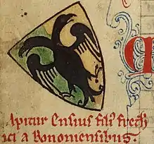 À l’Ouest, la plus ancienne mention héraldique est le fait de Matthieu Paris, dans un manuscrit à l’attention de Frédéric II du Saint-Empire datant de 1250 (voir illustration). L’adoption de l’aigle bicéphale, qui plus est par un fils bâtard de l’empereur du Saint-Empire romain germanique, précéderait donc de dix ans l’arrivée au pouvoir des Paléologue auxquels est traditionnellement attribuée la primauté du symbole. Toutefois certains historiens grecs[6] repoussent d’autant, voire de deux siècles, jusqu’à Isaac Ier Comnène (1057-1059) l’usage héraldique de l’oiseau impérial.