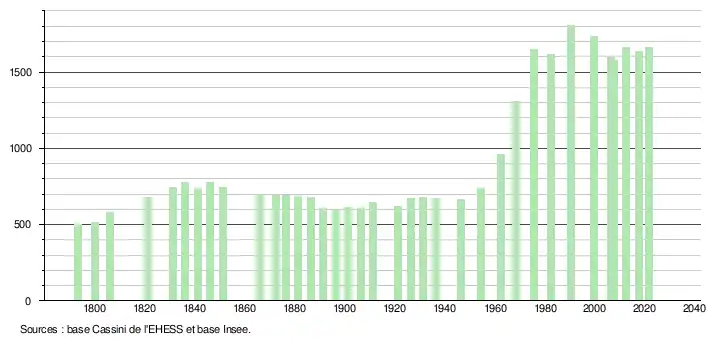 L'évolution du nombre d'habitants est connue à travers les recensements de la population effectués dans la commune depuis 1793. Pour les communes de moins de 10 000 habitants, une enquête de recensement portant sur toute la population est réalisée tous les cinq ans, les populations légales des années intermédiaires étant quant à elles estimées par interpolation ou extrapolation[33]. Pour la commune, le premier recensement exhaustif entrant dans le cadre du nouveau dispositif a été réalisé en 2007[34].
