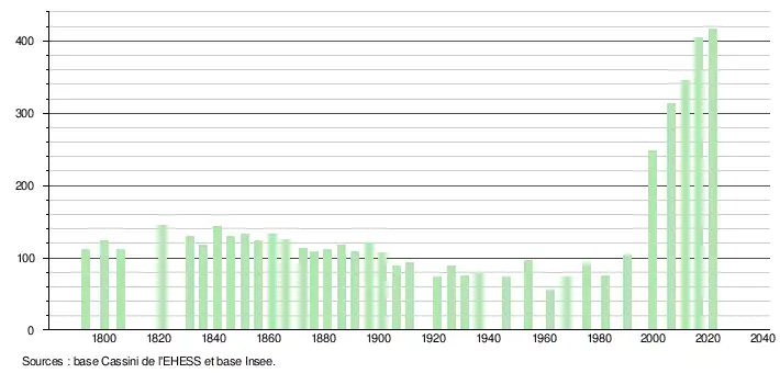 L'évolution du nombre d'habitants est connue à travers les recensements de la population effectués dans la commune depuis 1793. Pour les communes de moins de 10 000 habitants, une enquête de recensement portant sur toute la population est réalisée tous les cinq ans, les populations légales des années intermédiaires étant quant à elles estimées par interpolation ou extrapolation[22]. Pour la commune, le premier recensement exhaustif entrant dans le cadre du nouveau dispositif a été réalisé en 2006[23].