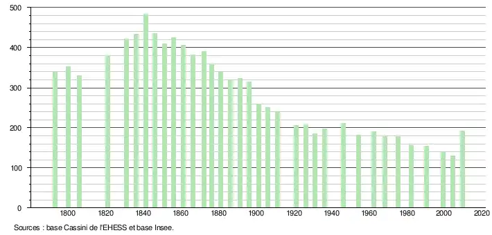 L'évolution du nombre d'habitants est connue à travers les recensements de la population effectués dans la commune depuis 1793. À partir du , les populations légales des communes sont publiées annuellement dans le cadre d'un recensement qui repose désormais sur une collecte d'information annuelle, concernant successivement tous les territoires communaux au cours d'une période de cinq ans. Pour les communes de moins de 10 000 habitants, une enquête de recensement portant sur toute la population est réalisée tous les cinq ans, les populations légales des années intermédiaires étant quant à elles estimées par interpolation ou extrapolation[5]. Pour la commune, le premier recensement exhaustif entrant dans le cadre du nouveau dispositif a été réalisé en 2004[6],[Note 2].