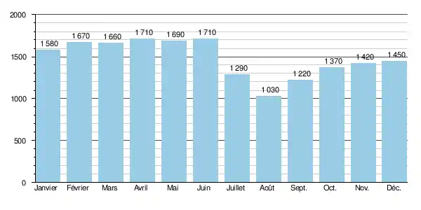 Quant aux crues, elles ne sont guère importantes. Les QIX 2 et QIX 5 valent respectivement 4,1 et 6,9 m3/s. Le QIX 10 est de 8,8 m3/s, le QIX 20 de 11 m3/s, tandis que le QIX 50 se monte à 13 m3/s.
