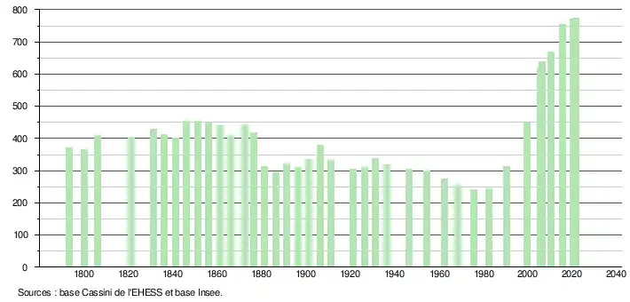 L'évolution du nombre d'habitants est connue à travers les recensements de la population effectués dans la commune depuis 1793. Pour les communes de moins de 10 000 habitants, une enquête de recensement portant sur toute la population est réalisée tous les cinq ans, les populations légales des années intermédiaires étant quant à elles estimées par interpolation ou extrapolation[23]. Pour la commune, le premier recensement exhaustif entrant dans le cadre du nouveau dispositif a été réalisé en 2005[24].