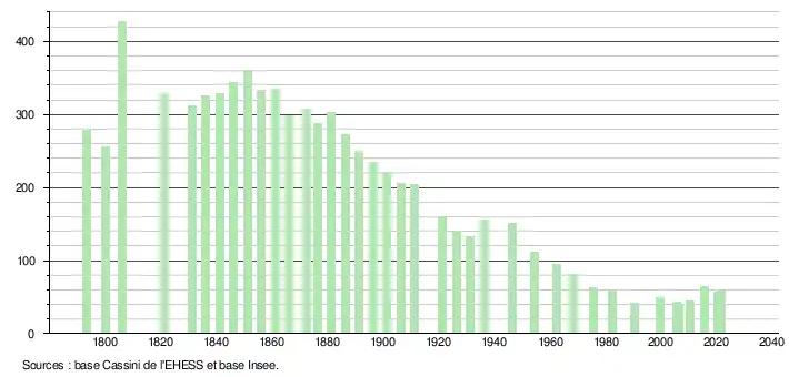 | L'évolution du nombre d'habitants est connue à travers les recensements de la population effectués dans la commune depuis 1793. Pour les communes de moins de 10 000 habitants, une enquête de recensement portant sur toute la population est réalisée tous les cinq ans, les populations légales des années intermédiaires étant quant à elles estimées par interpolation ou extrapolation[39]. Pour la commune, le premier recensement exhaustif entrant dans le cadre du nouveau dispositif a été réalisé en 2005[40]. En 2021, la commune comptait 58 habitants[Note 4], en diminution de 9,37 % par rapport à 2015 (Ariège : +1,38 %, France hors Mayotte : +1,84 %). |