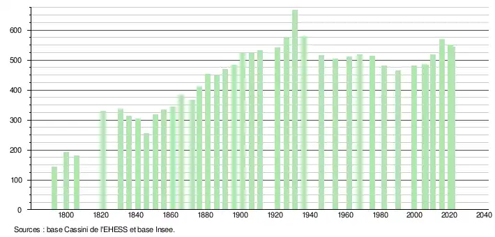 L'évolution du nombre d'habitants est connue à travers les recensements de la population effectués dans la commune depuis 1793. Pour les communes de moins de 10 000 habitants, une enquête de recensement portant sur toute la population est réalisée tous les cinq ans, les populations légales des années intermédiaires étant quant à elles estimées par interpolation ou extrapolation[29]. Pour la commune, le premier recensement exhaustif entrant dans le cadre du nouveau dispositif a été réalisé en 2005[30].