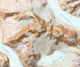 - le versant sud, où se développe notamment sa voie d'ascension normale, le couloir Whymper. L'accès se fait par le refuge du couvercle (2 867 mètres). La descente par cette voie est périlleuse et suppose de tenir un horaire serré (redescendre avant que le couloir ne soit trop exposé au soleil) et d'excellentes conditions de neige et de glace ; une ligne de rappel récemment mise en place[Quand ?] permet actuellement une descente moins risquée ;