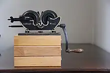 - la meule, pierre taillée en cylindre, tourne, et la lame est fermement mise en place contre la tranche de la meule pour procéder à l'aiguisage. La meule, si elle tourne trop vite et à sec, va « brûler » la trempe et endommager la lame. Ce risque est supprimé en installant un système d'arrosage continuel sur la meule. Des assistances à l'aiguisage manuel peuvent guider la lame contre la pierre avec un angle prédéterminé[note 2] ;