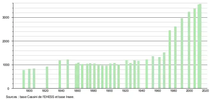 L'évolution du nombre d'habitants est connue à travers les recensements de la population effectués dans la commune depuis 1793. À partir du , les populations légales des communes sont publiées annuellement dans le cadre d'un recensement qui repose désormais sur une collecte d'information annuelle, concernant successivement tous les territoires communaux au cours d'une période de cinq ans. Pour les communes de moins de 10 000 habitants, une enquête de recensement portant sur toute la population est réalisée tous les cinq ans, les populations légales des années intermédiaires étant quant à elles estimées par interpolation ou extrapolation[5]. Pour la commune, le premier recensement exhaustif entrant dans le cadre du nouveau dispositif a été réalisé en 2006[6],[Note 1].