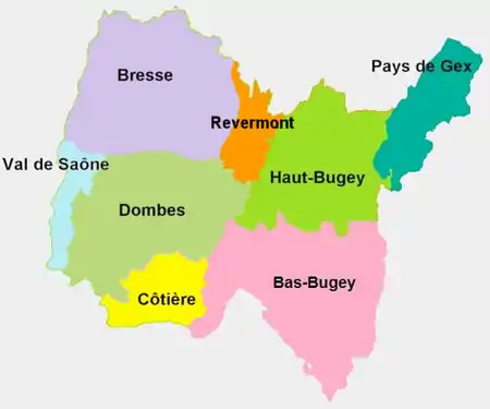 Le département est composé de plusieurs entités culturelles et historiques : la Bresse savoyarde, la Dombes, le Bugey et le pays de Gex en sont les principales.