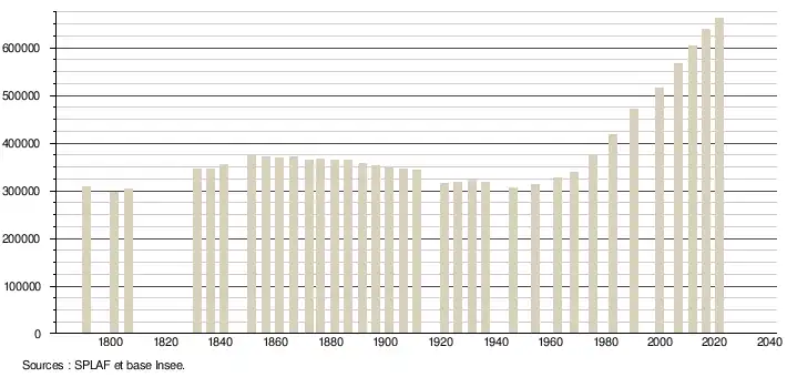 - Population municipale légale en vigueur au 1er janvier 2024, millésimée 2021, définie dans les limites territoriales en vigueur au 1er janvier 2023, date de référence statistique : 1er janvier 2021.