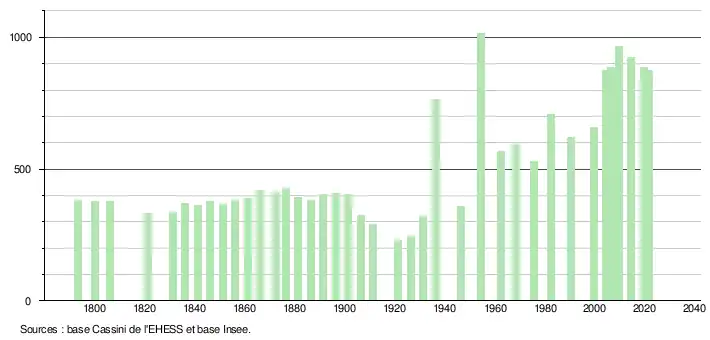 L'évolution du nombre d'habitants est connue à travers les recensements de la population effectués dans la commune depuis 1793. Pour les communes de moins de 10 000 habitants, une enquête de recensement portant sur toute la population est réalisée tous les cinq ans, les populations légales des années intermédiaires étant quant à elles estimées par interpolation ou extrapolation[33]. Pour la commune, le premier recensement exhaustif entrant dans le cadre du nouveau dispositif a été réalisé en 2004[34].