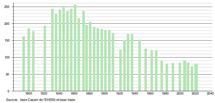 L'évolution du nombre d'habitants est connue à travers les recensements de la population effectués dans la commune depuis 1793. Pour les communes de moins de 10 000 habitants, une enquête de recensement portant sur toute la population est réalisée tous les cinq ans, les populations légales des années intermédiaires étant quant à elles estimées par interpolation ou extrapolation[18]. Pour la commune, le premier recensement exhaustif entrant dans le cadre du nouveau dispositif a été réalisé en 2005[19].