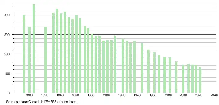 L'évolution du nombre d'habitants est connue à travers les recensements de la population effectués dans la commune depuis 1793. Pour les communes de moins de 10 000 habitants, une enquête de recensement portant sur toute la population est réalisée tous les cinq ans, les populations légales des années intermédiaires étant quant à elles estimées par interpolation ou extrapolation[51]. Pour la commune, le premier recensement exhaustif entrant dans le cadre du nouveau dispositif a été réalisé en 2006[52].