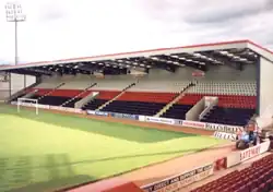 • Lors de la saison 2007–2008 en finale des barrages de montée (défaite 3–0 sur l'ensemble des deux matchs contre Clyde)[41]. Cependant, la relégation administrative de Gretna en Third Division[42], après avoir été mis en redressement judiciaire[43], entraîne une restructuration des championnats, et Airdrie est promu en First Division en tant que finaliste des barrages[44].