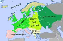 - en Europe occidentale entre l'Europe latine, où l'héritage de l'empire romain est resté dominant, et l'Europe germanique, où il a été fortement syncrétisé avec la culture germanique