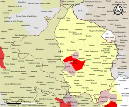 Haute-Saône16Belfahy, Brevilliers, Chagey, Châlonvillars, Champagney, Chenebier, Échavanne, Échenans-sous-Mont-Vaudois, Errevet, Frahier-et-Chatebier, Magny-Danigon, Malbouhans, Mandrevillars, Plancher-Bas, Plancher-les-Mines, Ronchamp.