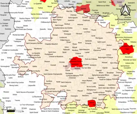 Communes de la couronnePuy-de-Dôme204Aigueperse, Artonne, Aubiat, Aulnat, Aurières, Authezat, Aydat, Beaumont-lès-Randan, Beauregard-l'Évêque, Beauregard-Vendon, Billom, Blanzat, Blot-l'Église, Bongheat, Bort-l'Étang, Bouzel, Brenat, Bromont-Lamothe, Bulhon, Busséol, Bussières-et-Pruns, Cébazat, Le Cendre, Ceyrat, Ceyssat, Chadeleuf, Chambon-sur-Lac, Champeix, Champs, Chanat-la-Mouteyre, Chanonat, Chapdes-Beaufort, Chappes, Chaptuzat, Charbonnières-les-Varennes, Charbonnières-les-Vieilles, Charnat, Chas, Châteaugay, Châtel-Guyon, Chauriat, Chavaroux, Le Cheix, Chidrac, Clémensat, Clerlande, Combronde, Corent, Coudes, Cournols, Cournon-d'Auvergne, Le Crest, Crevant-Laveine, Culhat, Davayat, Dorat, Durtol, Effiat, Égliseneuve-près-Billom, Ennezat, Entraigues, Enval, Espirat, Estandeuil, Fayet-le-Château, Aulhat-Flat, Gelles, Gerzat, Gimeaux, Glaine-Montaigut, La Goutelle, Grandeyrolles, Isserteaux, Joze, Jozerand, Laps, Lempdes, Lempty, Lezoux, Loubeyrat, Ludesse, Lussat, Luzillat, Malauzat, Malintrat, Manglieu, Manzat, Marcillat, Maringues, Marsat, Les Martres-d'Artière, Les Martres-de-Veyre, Martres-sur-Morge, Mauzun, Mazaye, Meilhaud, Ménétrol, Mur-sur-Allier, Mirefleurs, Miremont, Moissat, Montaigut-le-Blanc, Montcel, Montfermy, Montmorin, Montpensier, Montpeyroux, Chambaron sur Morge, Mozac, Nébouzat, Neschers, Neuville, Nohanent, Olby, Olloix, Orbeil, Orcet, Orcines, Orléat, Pardines, Parent, Parentignat, Pérignat-lès-Sarliève, Pérignat-sur-Allier, Perrier, Pessat-Villeneuve, Pignols, Plauzat, Pont-du-Château, Pontgibaud, Pouzol, Prompsat, Prondines, Pulvérières, Puy-Saint-Gulmier, Ravel, Reignat, Riom, La Roche-Blanche, La Roche-Noire, Romagnat, Saint-Agoulin, Saint-Amant-Tallende, Saint-André-le-Coq, Saint-Angel, Saint-Babel, Saint-Beauzire, Saint-Bonnet-lès-Allier, Saint-Bonnet-près-Orcival, Saint-Bonnet-près-Riom, Saint-Cirgues-sur-Couze, Saint-Clément-de-Régnat, Saint-Denis-Combarnazat, Saint-Diéry, Saint-Genès-Champanelle, Saint-Georges-sur-Allier, Saint-Hilaire-la-Croix, Saint-Ignat, Saint-Jacques-d'Ambur, Saint-Jean-d'Heurs, Saint-Jean-des-Ollières, Saint-Julien-de-Coppel, Saint-Laure, Saint-Maurice, Saint-Myon, Saint-Ours, Saint-Pardoux, Saint-Pierre-le-Chastel, Saint-Pierre-Roche, Saint-Quintin-sur-Sioule, Saint-Rémy-de-Blot, Saint-Sandoux, Saint-Saturnin, Saint-Vincent, Saint-Yvoine, Sallèdes, Sardon, Saulzet-le-Froid, Sauvagnat-Sainte-Marthe, La Sauvetat, Sayat, Seychalles, Sugères, Surat, Tallende, Teilhède, Thuret, Tortebesse, Trézioux, Usson, Varennes-sur-Morge, Varennes-sur-Usson, Vassel, Vensat, Le Vernet-Sainte-Marguerite, Vernines, Verrières, Vertaizon, Veyre-Monton, Vic-le-Comte, Vinzelles, Volvic, Yronde-et-Buron, Yssac-la-Tourette.