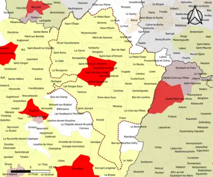 Localisation de l'aire d'attraction de Saint-Dié-des-Vosges dans le département des Vosges. | |