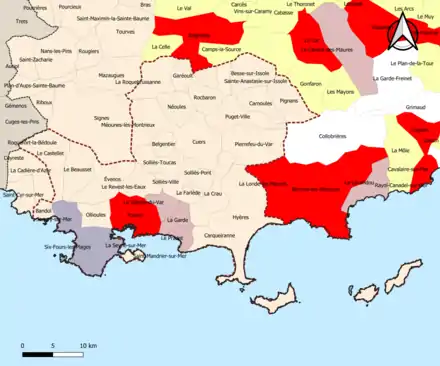 Localisation de l'aire d'attraction de Toulon dans le département du Var. | |