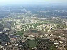 L'aéroport international O'Hare de Chicago (ORD) est le quatrième aéroport du monde par nombre de passagers[21], le deuxième aéroport des États-Unis derrière l'aéroport international Hartsfield-Jackson d'Atlanta et le plus important de la région du Midwest. Il se situe sur le territoire de la ville de Chicago, dans le quartier d'O'Hare à l'extrémité nord-ouest de la ville, à environ 27 kilomètres de Downtown Chicago.