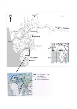 - Une aire marine centrale, essentiellement constituée par le bolon de Bamboung et ses ramifications. D’une longueur de 15 kilomètres à partir du confluent avec le Diomboss jusqu’aux vasières de la forêt de Kolé, sa superficie est d’environ 3 kilomètres carrés. Sa largeur varie de 50 à 500 mètres et sa profondeur fluctue entre 0 et 15 mètres. Il présente un réseau de canaux secondaires très dense. En raison de la présence d’une nappe phréatique importante sur l’île Coco (rive est), des sources souterraines se jettent dans le bolon, réduisant ainsi localement la salinité. Ces conditions spécifiques sont susceptibles de créer un environnement favorable à la faune aquatique.