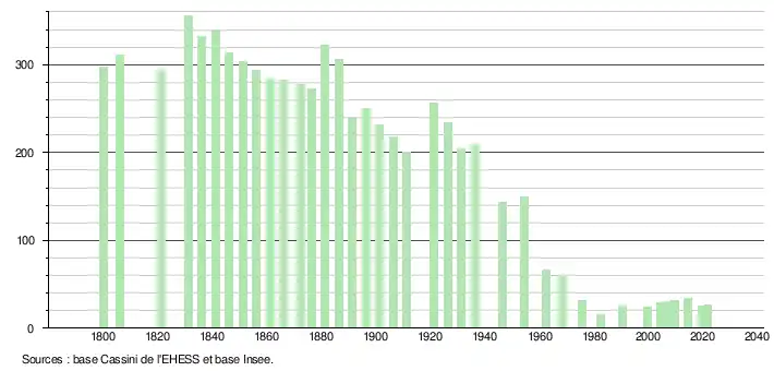 L'évolution du nombre d'habitants est connue à travers les recensements de la population effectués dans la commune depuis 1800. Pour les communes de moins de 10 000 habitants, une enquête de recensement portant sur toute la population est réalisée tous les cinq ans, les populations légales des années intermédiaires étant quant à elles estimées par interpolation ou extrapolation[10]. Pour la commune, le premier recensement exhaustif entrant dans le cadre du nouveau dispositif a été réalisé en 2004[11].