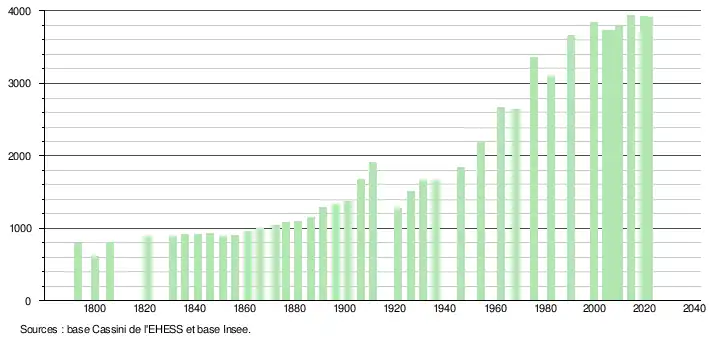 L'évolution du nombre d'habitants est connue à travers les recensements de la population effectués dans la commune depuis 1793. Pour les communes de moins de 10 000 habitants, une enquête de recensement portant sur toute la population est réalisée tous les cinq ans, les populations légales des années intermédiaires étant quant à elles estimées par interpolation ou extrapolation[35]. Pour la commune, le premier recensement exhaustif entrant dans le cadre du nouveau dispositif a été réalisé en 2004[36].