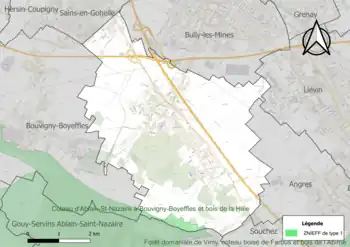 Le territoire communal comprend une ZNIEFF de type 1[Note 1] : le coteau d'Ablain-St-Nazaire à Bouvigny-Boyeffles et bois de la Haie. Ce site est composé d’une mosaïque de végétations neutrophiles à calcicoles sur un relief fortement marqué par la présence de vastes coteaux crayeux du Sénonien et du Turonien au nord d’Ablain-St-Nazaire[11].