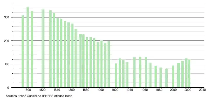 L'évolution du nombre d'habitants est connue à travers les recensements de la population effectués dans la commune depuis 1793. Pour les communes de moins de 10 000 habitants, une enquête de recensement portant sur toute la population est réalisée tous les cinq ans, les populations légales des années intermédiaires étant quant à elles estimées par interpolation ou extrapolation[25]. Pour la commune, le premier recensement exhaustif entrant dans le cadre du nouveau dispositif a été réalisé en 2007[26].