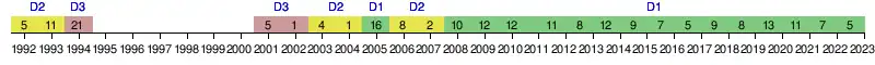 | 2007 | 2e | 90 | 42 | 28 | 6 | 8 | 69 | 27 | +42 | Seizièmes de finale | |