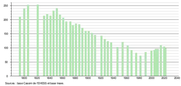 L'évolution du nombre d'habitants est connue à travers les recensements de la population effectués dans la commune depuis 1793. Pour les communes de moins de 10 000 habitants, une enquête de recensement portant sur toute la population est réalisée tous les cinq ans, les populations légales des années intermédiaires étant quant à elles estimées par interpolation ou extrapolation[22]. Pour la commune, le premier recensement exhaustif entrant dans le cadre du nouveau dispositif a été réalisé en 2004[23].
