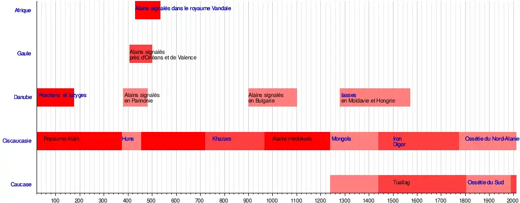 Au début de leur histoire connue, les Alains apparaissent comme issus du monde nomade iranophone qui avait dominé les steppes euroasiatiques depuis au moins le premier millénaire av. J.-C., avec les Scythes, les Sarmates, les Sakas (Saces), les Massagètes et les Tokhariens, dont ils partagent les traditions religieuses, guerrières et artistiques[7]. Leur langue est de type iranienne orientale comme celles des Sarmates et des Scythes d’Europe[8].