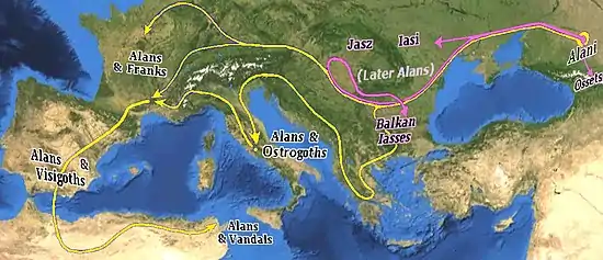 Lors des grandes invasions, leur défaite devant les Huns en l’an 375 de notre ère, inaugure une grande dispersion des populations alaniques, dont certaines rejoignent, comme alliés ou mercenaires, les royaumes germaniques d’Occident, tandis que d’autres se sédentarisent en Europe orientale, principalement au nord du Caucase où se développe une Alanie qui joue un rôle stratégique important, d’abord dans le conflit entre l’Empire sassanide et l’Empire romain d'Orient (VIe – VIIe siècles), puis entre l’Empire khazar et l’expansion arabe au Caucase (VIIIe – IXe siècles).
