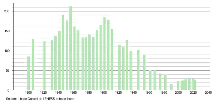 L'évolution du nombre d'habitants est connue à travers les recensements de la population effectués dans la commune depuis 1800. Pour les communes de moins de 10 000 habitants, une enquête de recensement portant sur toute la population est réalisée tous les cinq ans, les populations légales des années intermédiaires étant quant à elles estimées par interpolation ou extrapolation[11]. Pour la commune, le premier recensement exhaustif entrant dans le cadre du nouveau dispositif a été réalisé en 2004[12].