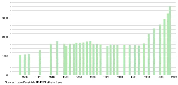 L'évolution du nombre d'habitants est connue à travers les recensements de la population effectués dans la commune depuis 1793. À partir du , les populations légales des communes sont publiées annuellement dans le cadre d'un recensement qui repose désormais sur une collecte d'information annuelle, concernant successivement tous les territoires communaux au cours d'une période de cinq ans. Pour les communes de moins de 10 000 habitants, une enquête de recensement portant sur toute la population est réalisée tous les cinq ans, les populations légales des années intermédiaires étant quant à elles estimées par interpolation ou extrapolation[9]. Pour la commune, le premier recensement exhaustif entrant dans le cadre du nouveau dispositif a été réalisé en 2005[10],[Note 1].