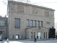 Grâce à la médiation de son frère Bruno, Giacometti participe à l'Exposition nationale suisse de 1939 à Zurich. Une draperie de plâtre qu'il a prévue pour le revêtement de façade du bâtiment « Textile et Mode » s'avère techniquement irréalisable ; la présentation d'une minuscule figure en plâtre sur un grand socle dans l'une des cours intérieures de 6 mètres du même bâtiment est rejetée car l'œuvre est considérée comme une parodie des artistes présentés. Au lieu de cela, le plâtre de près d'un mètre de haut de Giacometti Le Cube de 1933-1934, qui a été présenté à l'exposition de Lucerne en 1935, est transporté à Zurich et installé au rez-de-chaussée[37].