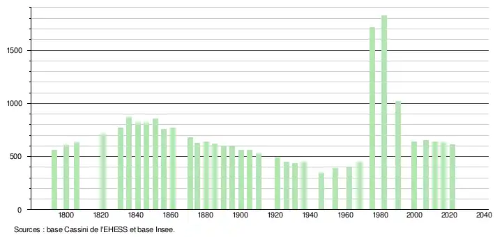 L'évolution du nombre d'habitants est connue à travers les recensements de la population effectués dans la commune depuis 1793. Pour les communes de moins de 10 000 habitants, une enquête de recensement portant sur toute la population est réalisée tous les cinq ans, les populations légales des années intermédiaires étant quant à elles estimées par interpolation ou extrapolation[26]. Pour la commune, le premier recensement exhaustif entrant dans le cadre du nouveau dispositif a été réalisé en 2006[27].