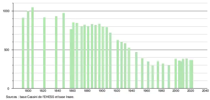 L'évolution du nombre d'habitants est connue à travers les recensements de la population effectués dans la commune depuis 1793. Pour les communes de moins de 10 000 habitants, une enquête de recensement portant sur toute la population est réalisée tous les cinq ans, les populations légales des années intermédiaires étant quant à elles estimées par interpolation ou extrapolation[20]. Pour la commune, le premier recensement exhaustif entrant dans le cadre du nouveau dispositif a été réalisé en 2004[21].