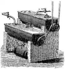 La lixiviation des cendres de bois[7], nommées ash en anglais, ou (die) Asche en allemand, est ici une pratique d'épuisement et de filtration des matières solubles par l'eau. Le lixiviat ou les eaux extraites sont recueillies soit dans des auges exposées au soleil ou chauffées jusqu'à évaporation totale et dessiccation, soit dans des creusets à l'origine en céramique, plus tard en métal ferreux, nommés pot en anglais, Pott en allemand, placés dans des fours jusqu'à dessiccation totale[8]. Les paysannes de Bretagne, de Picardie ou des Vosges appréciaient le bois de hêtre dans leurs cheminées ou poêles en fonte noire, elles en recueillaient les cendres. Les cendres mêlées à une matière grasse additionnelle fournissaient une lessive lors d'une cuisson des draps au chaudron ou pendant leur trempage à chaud dans un bac en bois[9].