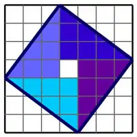 La science mésopotamienne apporte la puissance du calcul. Elle permet en géométrie un progrès que n'avaient probablement jamais réalisé les Égyptiens ou les Mésopotamiens. Un exemple est donné par les premières démonstrations partielles du théorème de Pythagore, que l'on attribue généralement à cette époque[62]. Elle ne s'applique que dans le cas où les côtés sont commensurables — c'est-à-dire où le triangle correspond à triplet pythagoricien — et utilise un quadrillage typique de l'arithmétique géométrique, illustré sur la figure de gauche. Dans cet exemple on cherche à trouver l'aire du carré en divers bleus, de côté l'hypoténuse d'un triangle rectangle, dont les autres côtés sont de longueurs 3 et 4. Le regroupement deux à deux des triangles intérieurs au carré bleu permet de conclure[63].